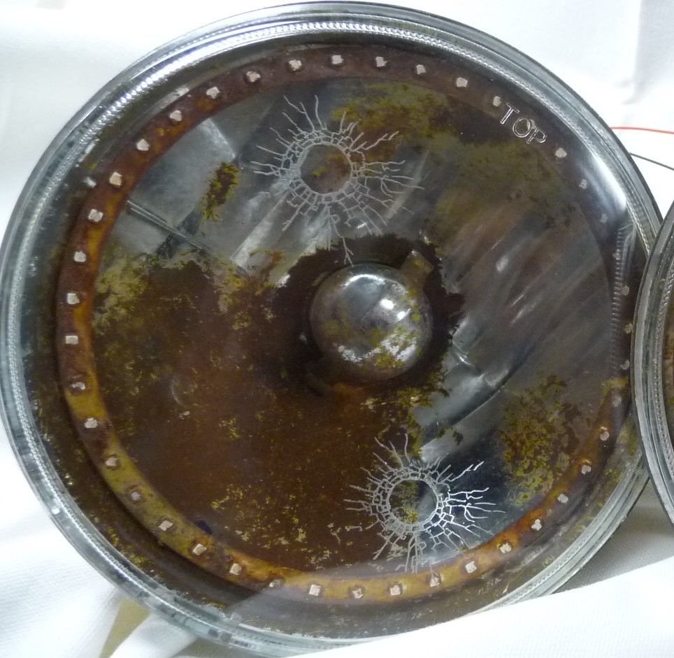 - Glass lens etched with bullet holes