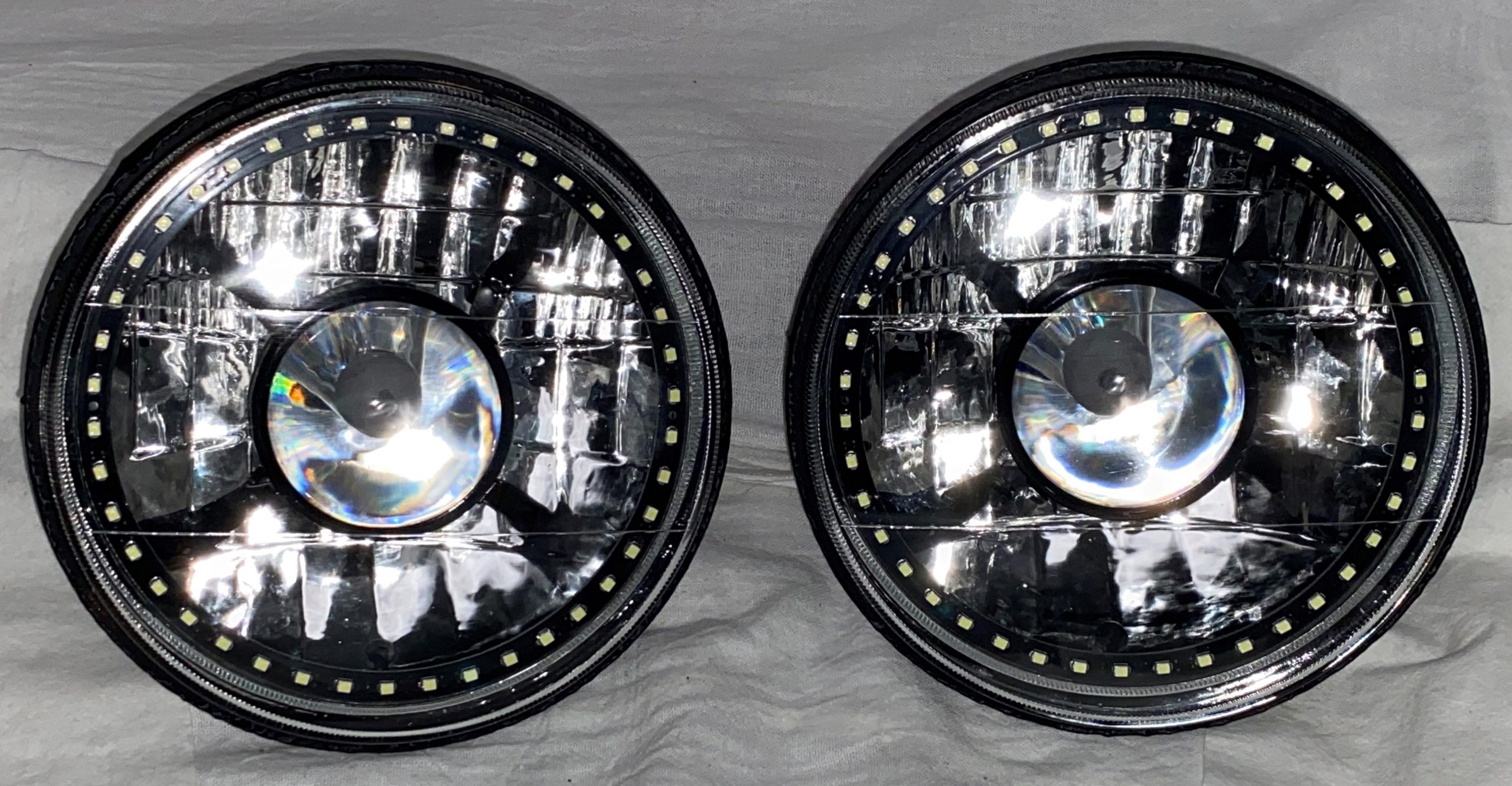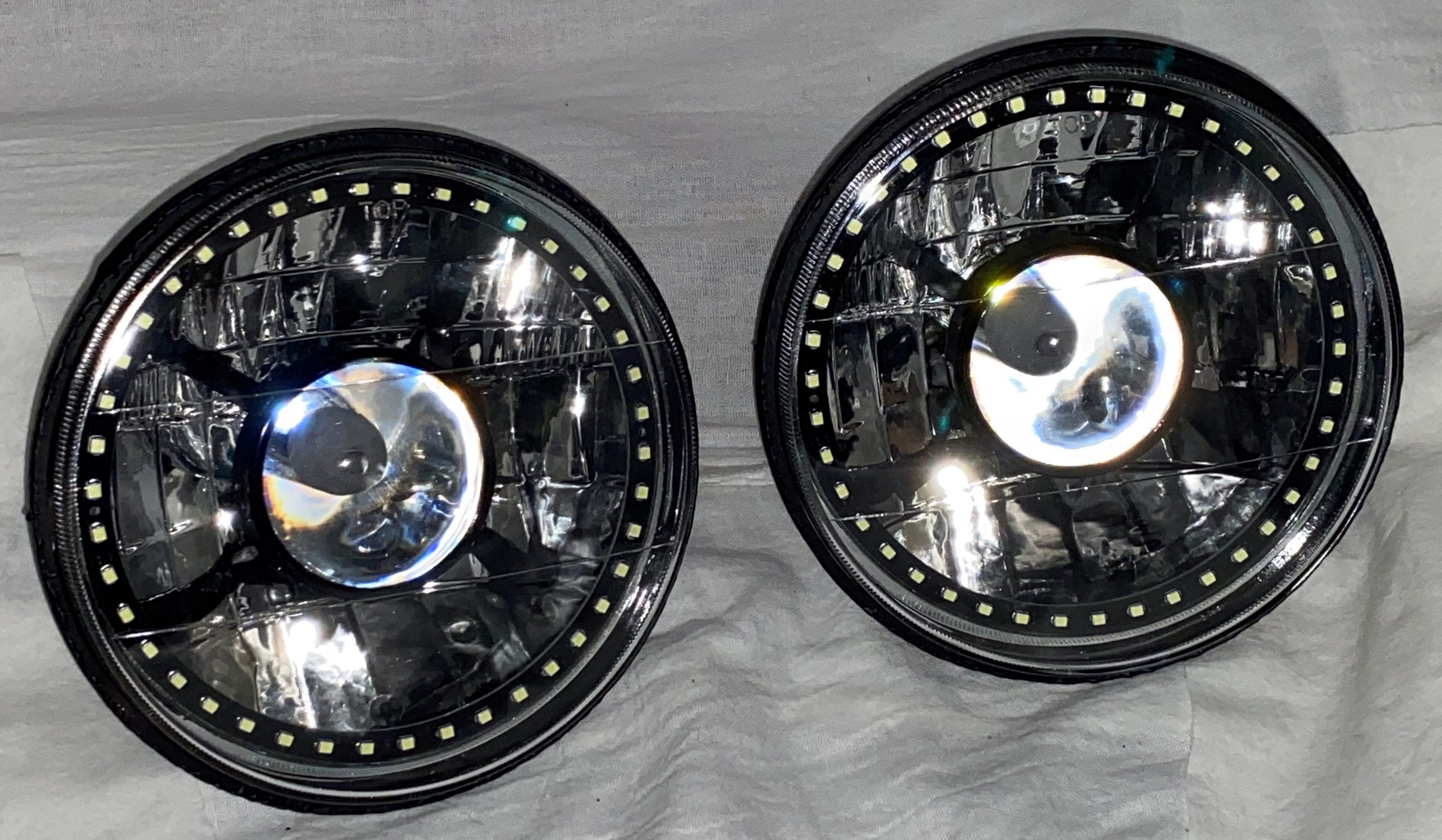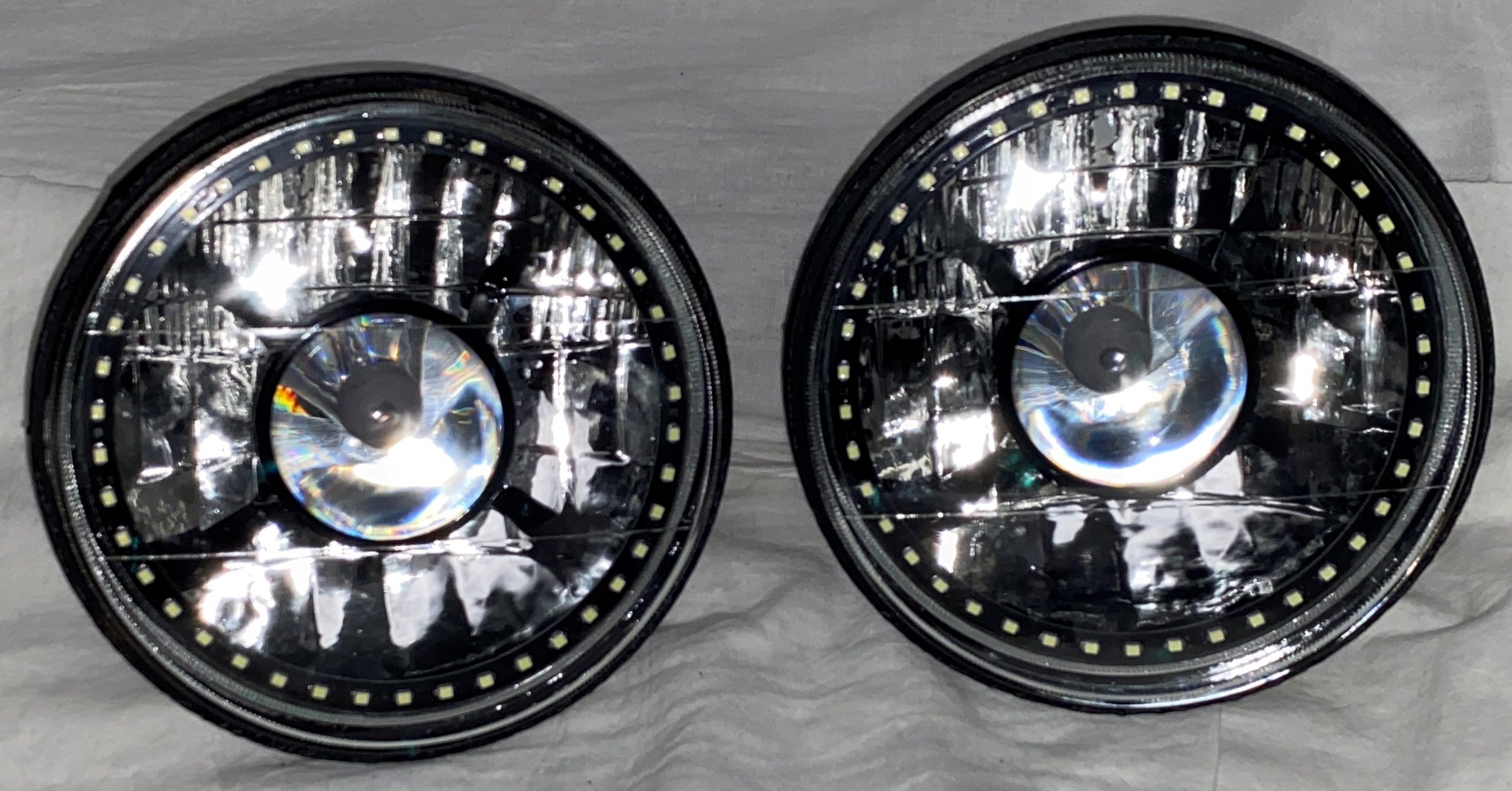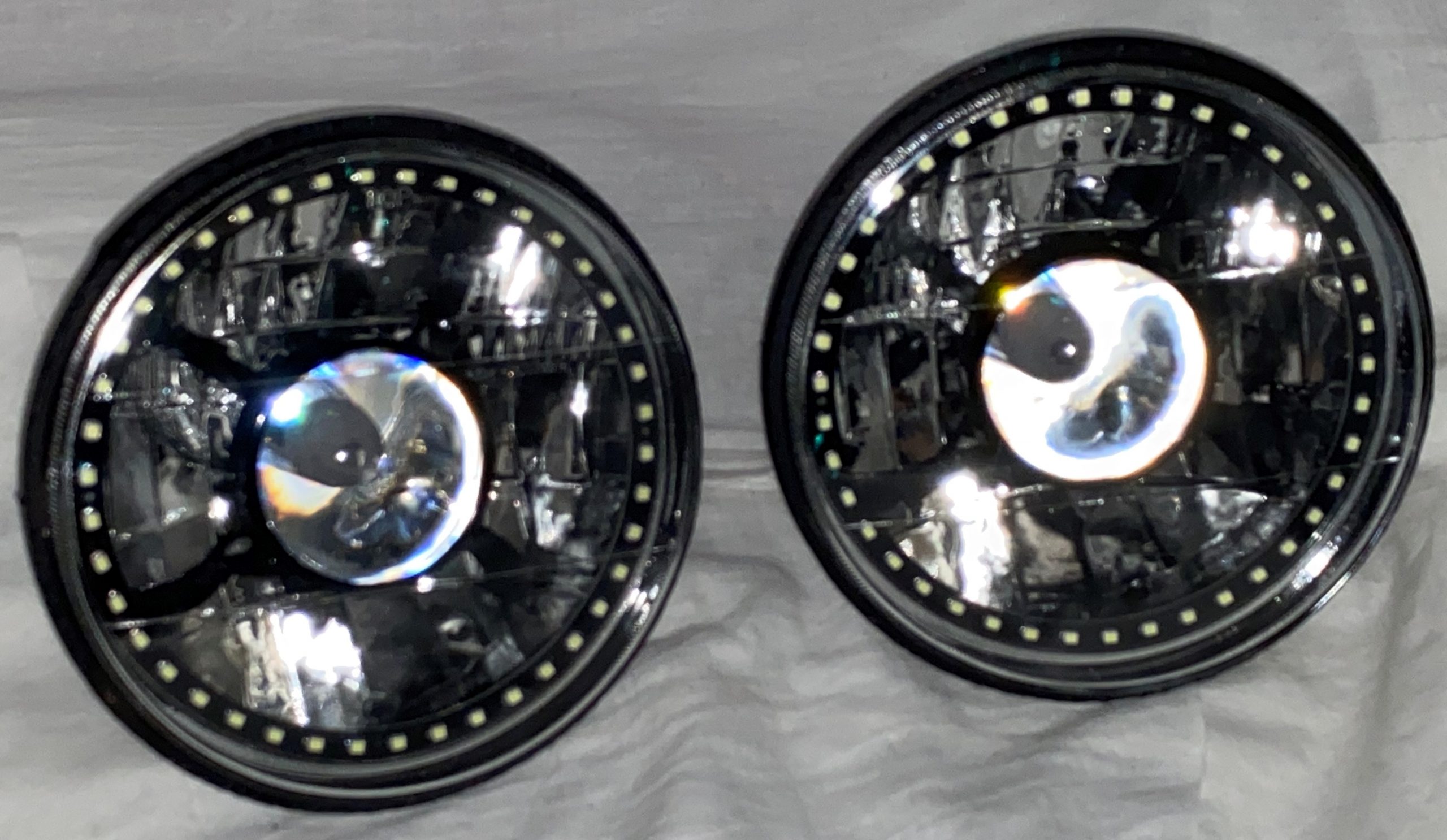 - (2) 7 Inch Round White Diamond Projector Single Color White Halo Black Illusion ™ Headlights