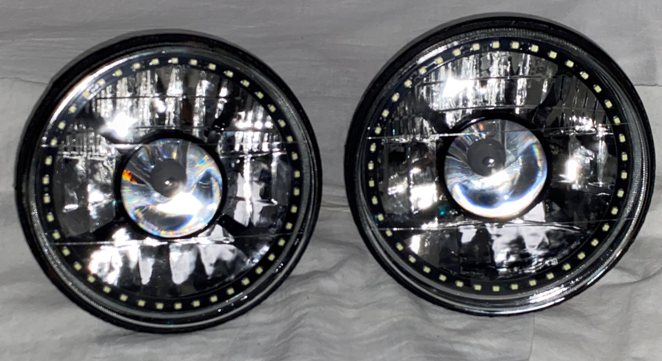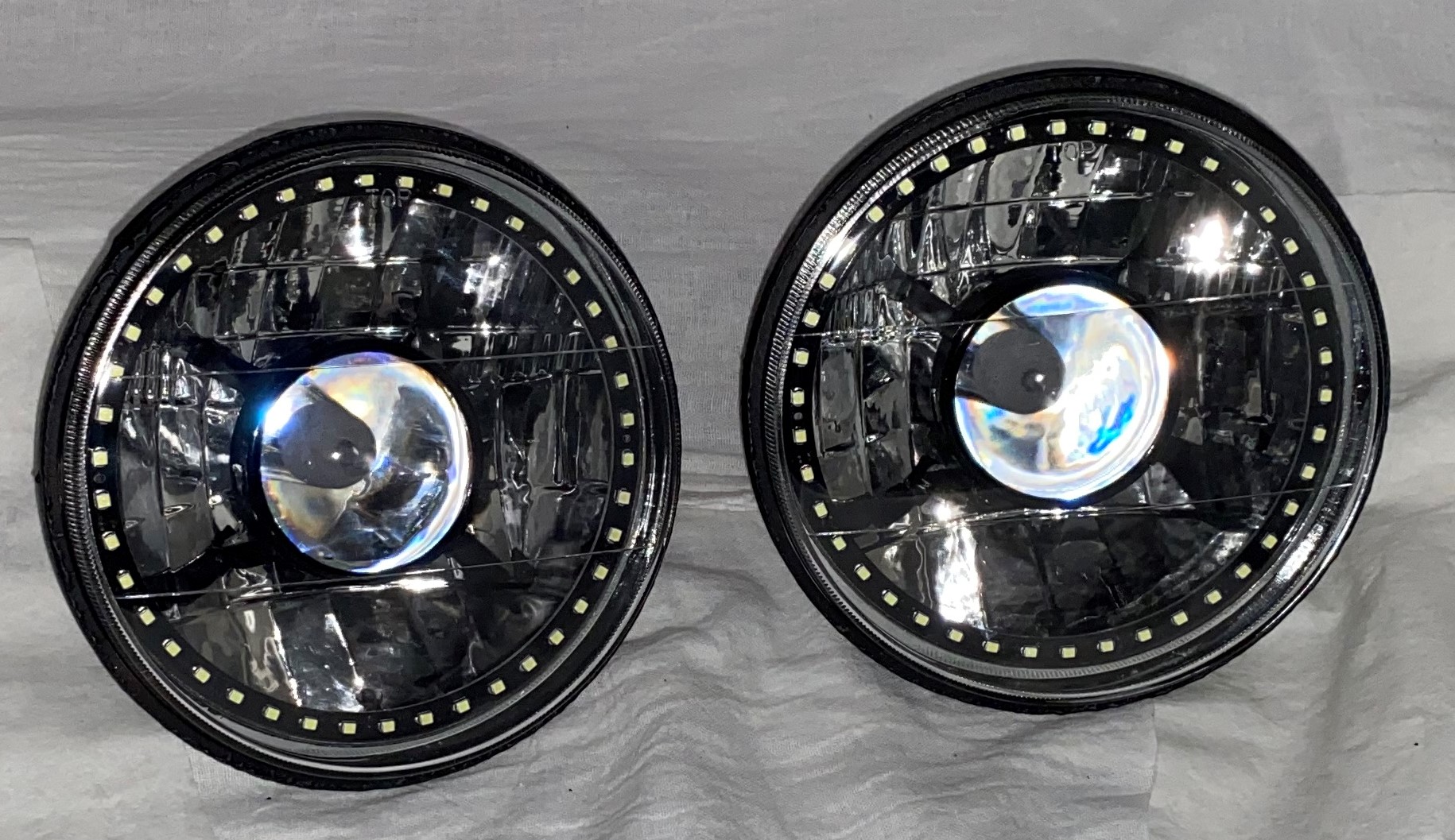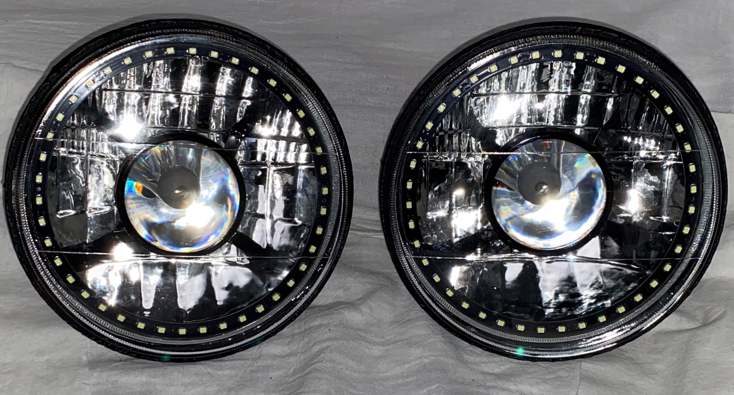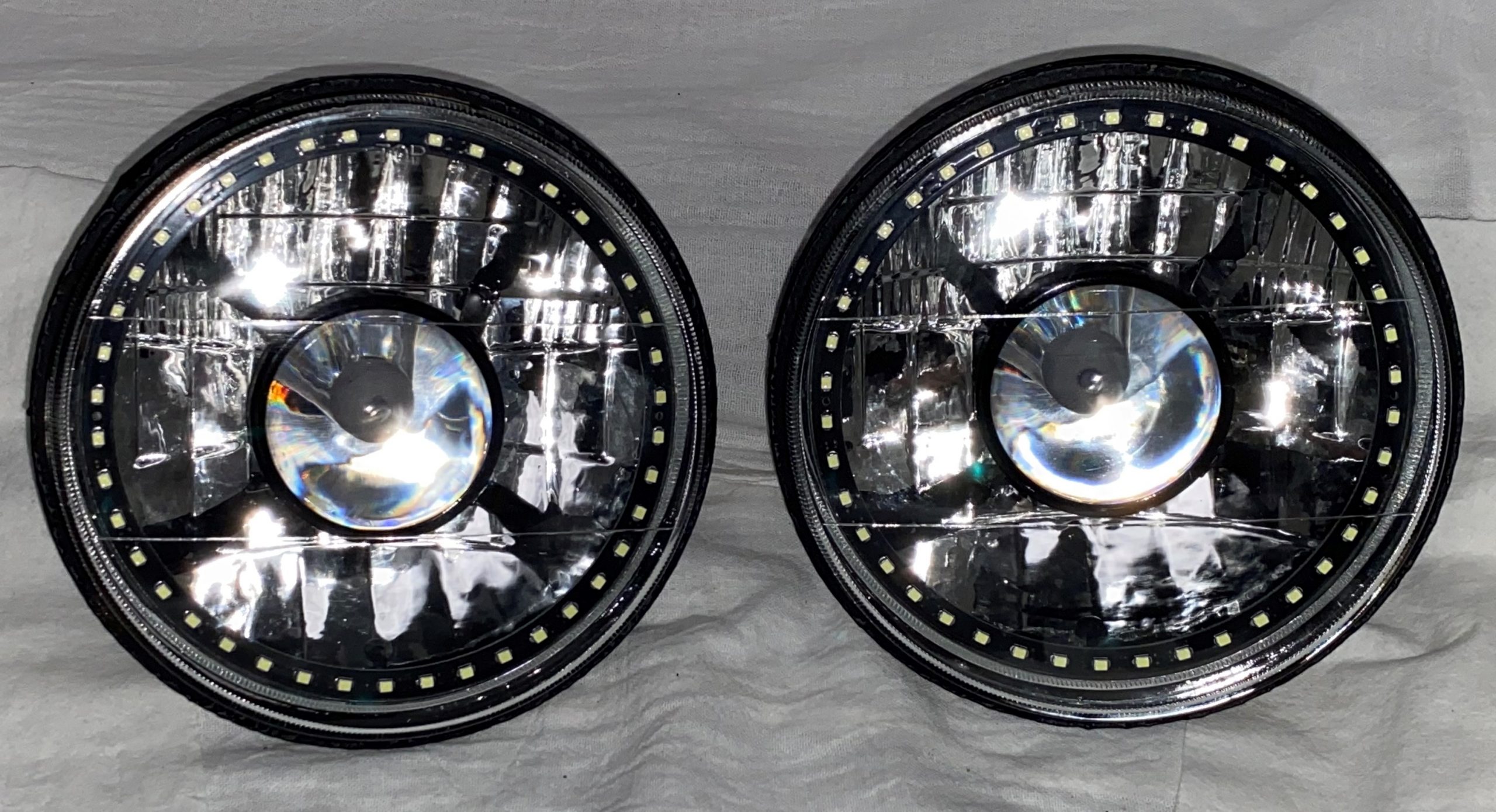 - (2) 7 Inch Round White Diamond Projector Single Color White Halo Black Illusion ™ Headlights